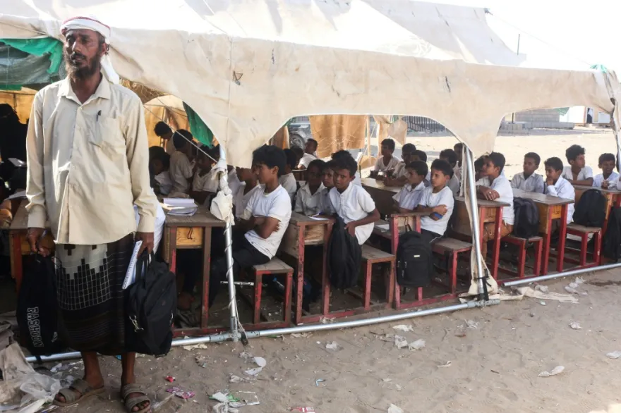 في خيمة تغطيها أقمشة مهترئة في فناء مدرسة حكومية في لحج قرب عدن، تشرح المدرّسة اليمنية سعاد صالح قواعد اللغة العربية لأكثر من 100 تلميذ اكتظ بهم المكان الضيق الخانق، غالبيتهم دون زيّ أو كُتب مدرسية.