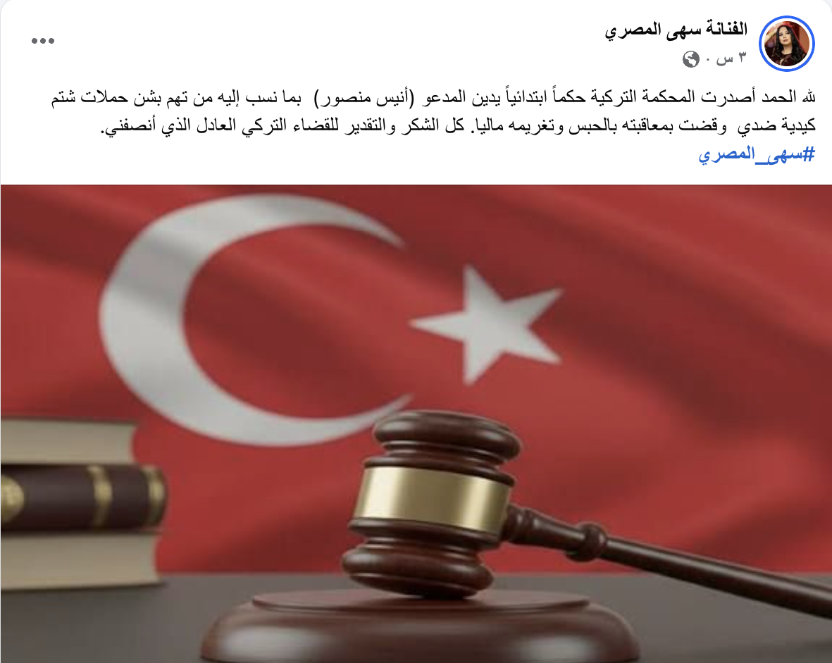 وقالت الفنانة سهى عبر حسابها في فيس بوك "لله الحمد أصدرت المحكمة التركية حكماً ابتدائياً يدين المدعو (أنيس منصور) بما نسب إليه من تهم بشن حملات شتم كيدية ضدي وقضت بمعاقبته بالحبس وتغريمه ماليا".