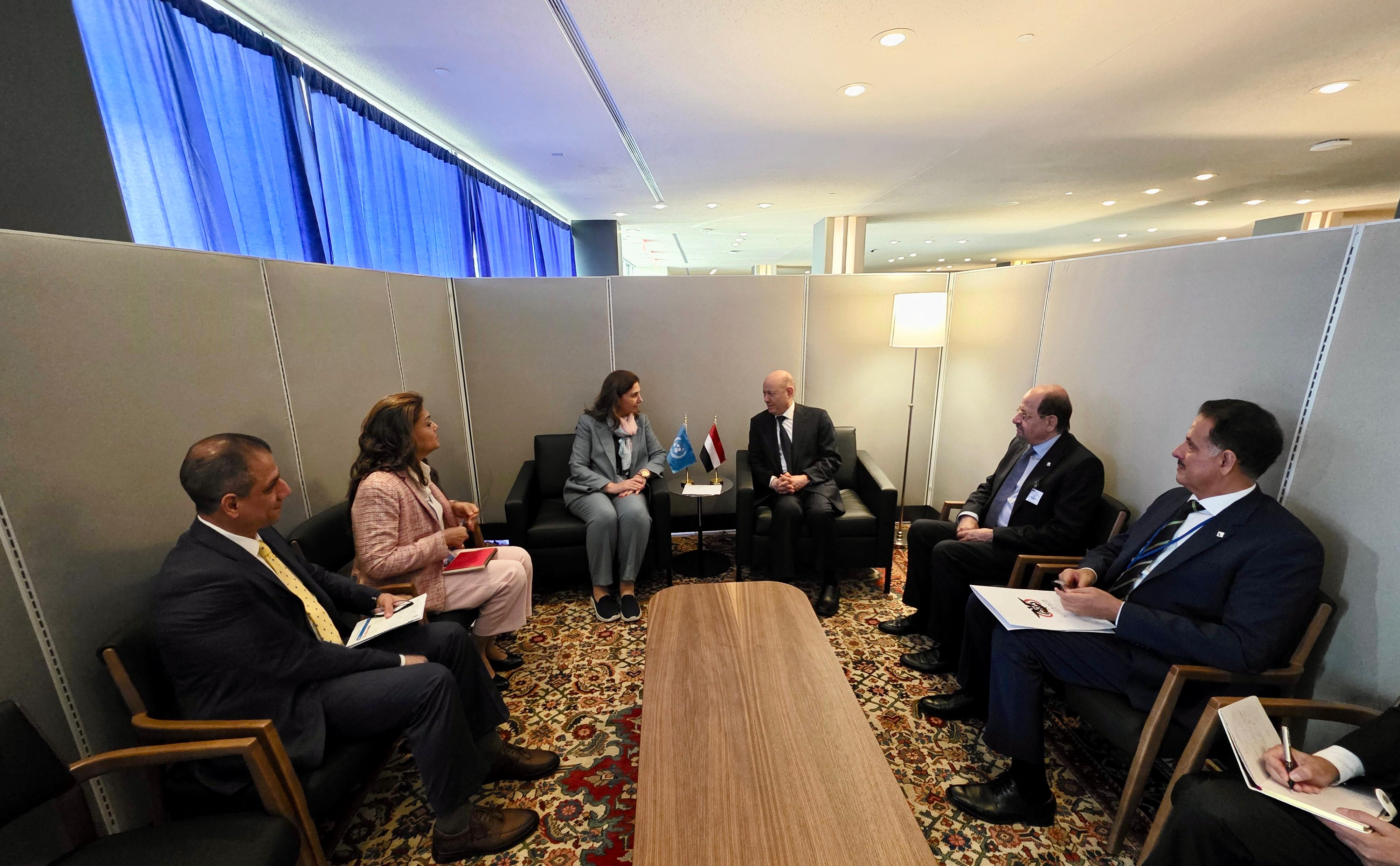 على هامش اجتماعات الجمعية العامة للأمم المتحدة، التقى رئيس مجلس القيادة الرئاسي رشاد العليمي، اليوم الأربعاء، بوكيلة الأمين العام للأمم المتحدة والأمينة التنفيذية للجنة الاقتصادية والاجتماعية لغرب آسيا (الإسكوا) رولا دشتي.