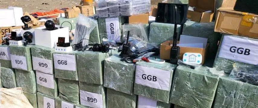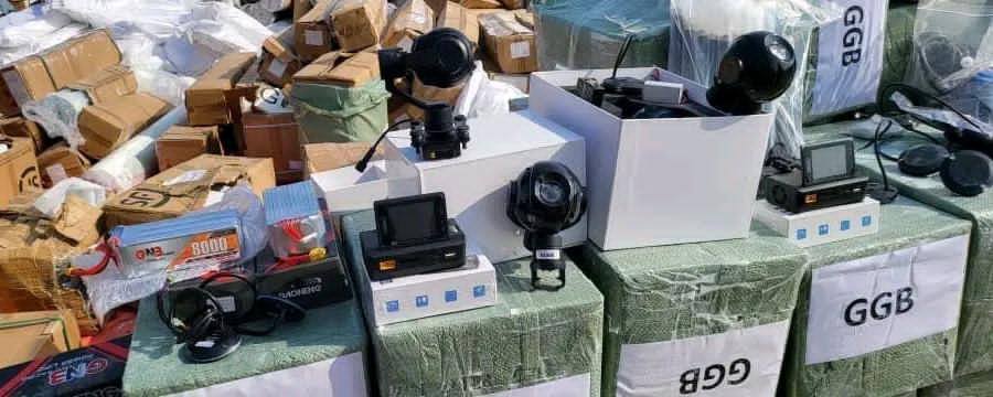 وتضم الشحنة المضبوطة كاميرات عالية الدقة مخصصة للطيران المسيّر لأغراض الاستطلاع والتصوير الجوي الليلي والنهاري، أجهزة الاتصال اللاسلكي وأدوات التحكم عن بُعد والرقائق الإلكترونية أجهزة تتبع (GPS Trackers)، بطاقات نظام تحديد المواقع العالمي (GPS)، وحدات تحكم إلكترونية (Flight Controllers)، أنظمة ملاحية متكاملة للطائرات المسيرة، بطاريات طاقة عالية السعة، محولات كهربائية دقيقة، قطع إلكترونية، مكونات ميكانيكية، وألياف الكاربون، التي تدخل ضمن أنظمة التشغيل والتوجيه والتصنيع للطيران المسيّر.