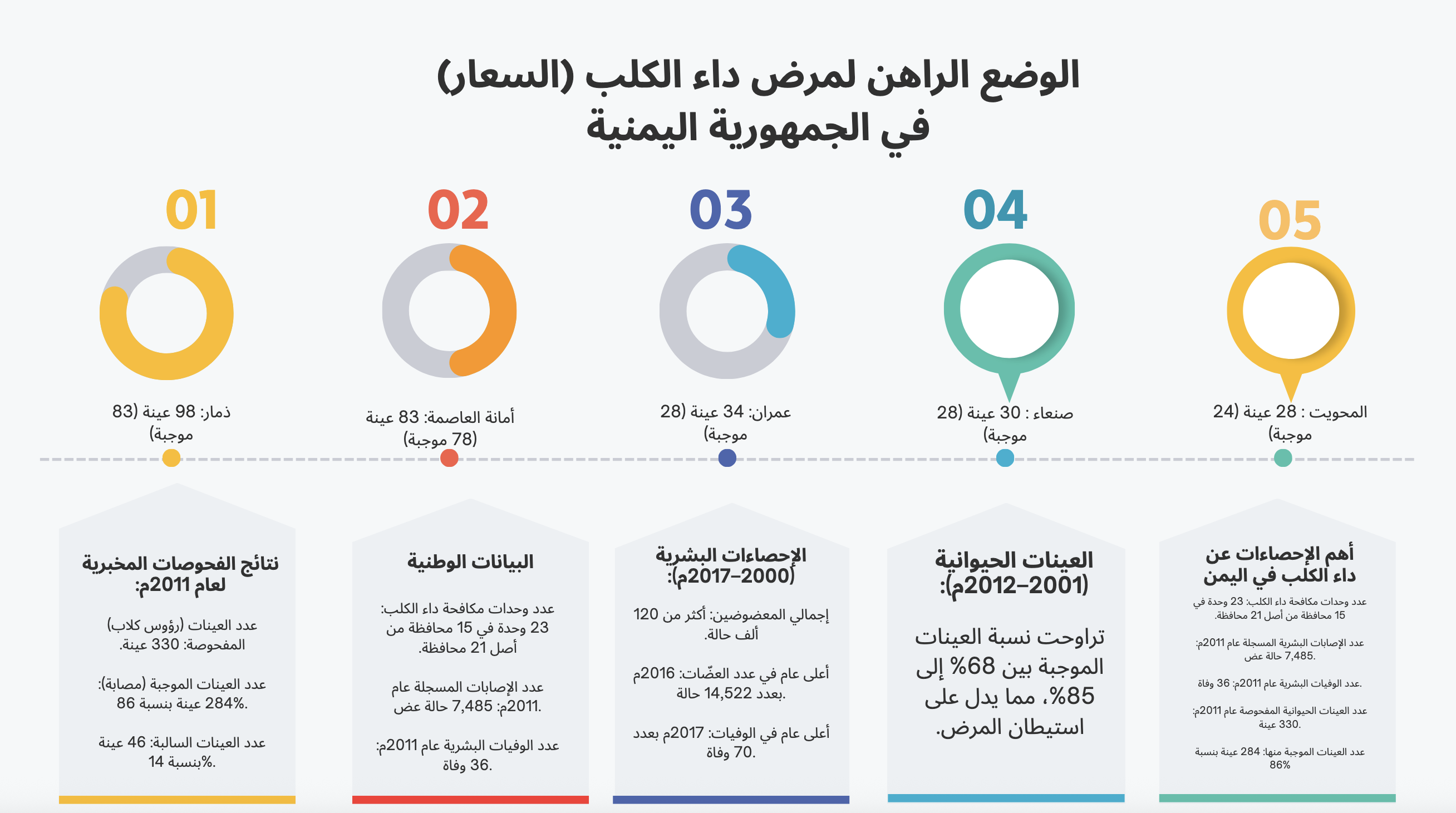 وتُظهر تقارير البرنامج الوطني لداء الكلب أن عدد الذين تعرضوا للعض في اليمن ارتفع بشكل ملحوظ خلال الفترة من عام 2000 إلى 2017.