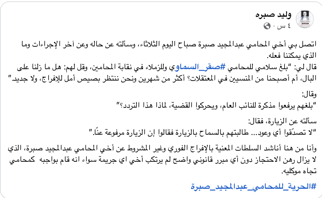 وقال وليد صبرة، إنه شقيقه المحامي المعتقل عبدالمجيد صبرة أتصل به، اليوم الثلاثاء، مطالبة من نقابة المحاميين برفع مذكرة للنائب العام وتحريك القضية، بعد شهرين من الاعتقال.